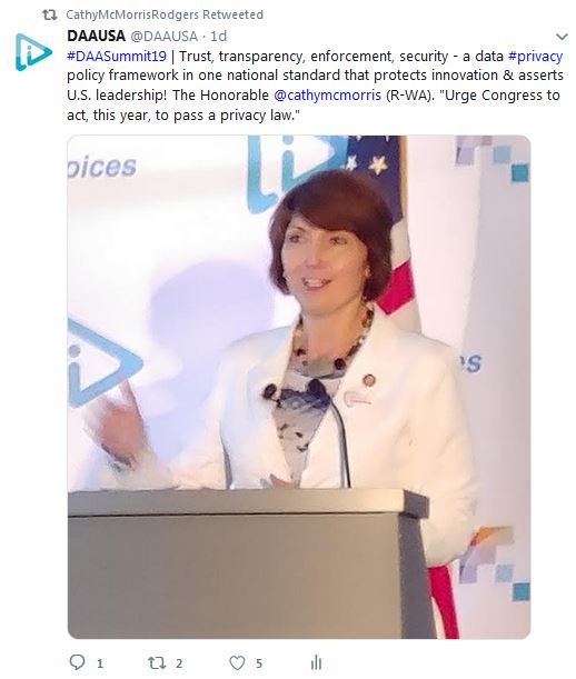 Rep. McMorris Rodgers so eloquently and persuasively presented the case for a single national standard during our Summit. While we cannot know how quickly Congress may act this year to move federal privacy legislation through both House and Senate chambers, there certainly is enthusiasm for this to occur – but it is imperative for citizens (as consumers and businesses) to contact their Members of Congress and encourage them to act.