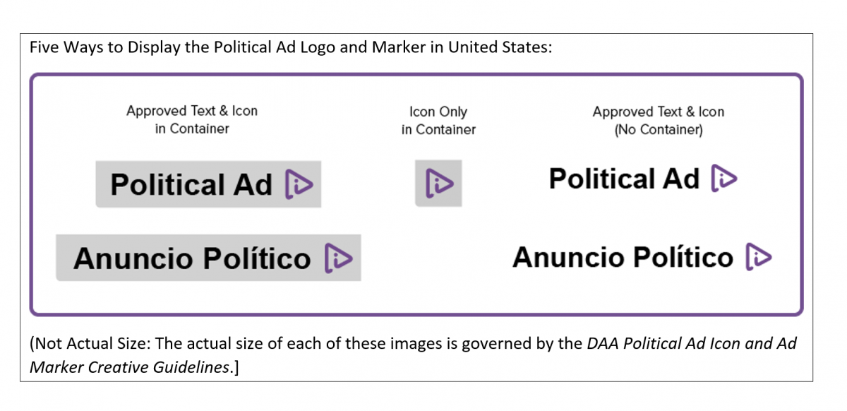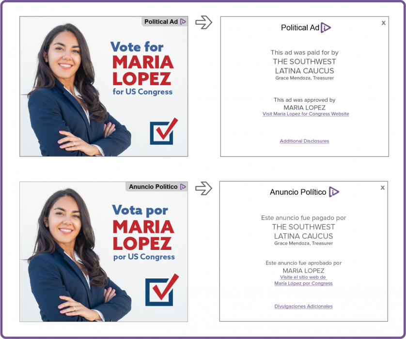 The icon and optional “Political Ad” wording (also in Spanish) on the marker should link to disclosures that include: